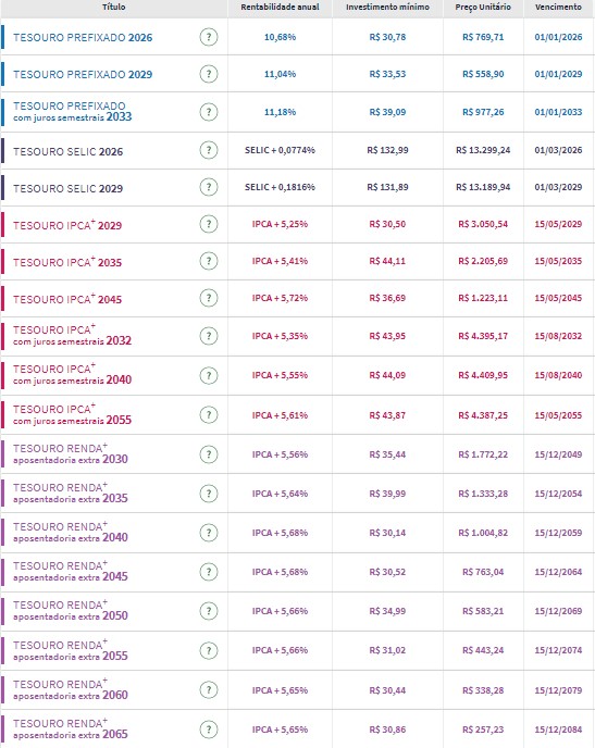 Confira os preços e as taxas dos títulos públicos disponíveis para compra no Tesouro Direto na tarde desta segunda-feira (5):